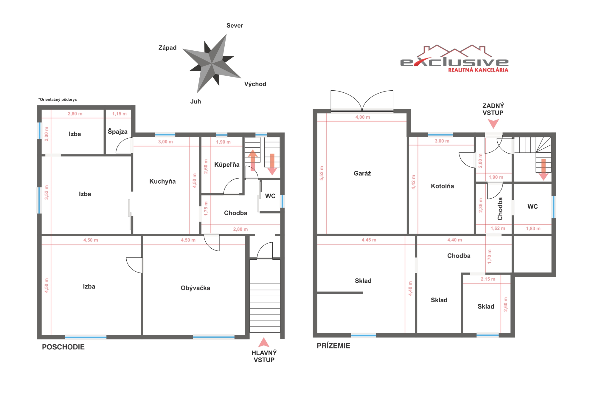 - Prízemie: garáž, kotolňa, zádverie, toaleta, chodba a 3x sklad